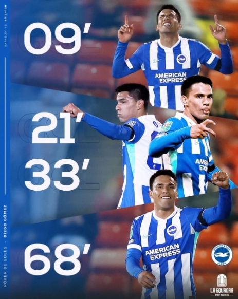 09月24日讯 职业联赛 杯第三轮,布莱顿6-0巴恩斯利。本场赛事 ,迭戈-戈麦斯代表布莱顿上演了大四喜。
