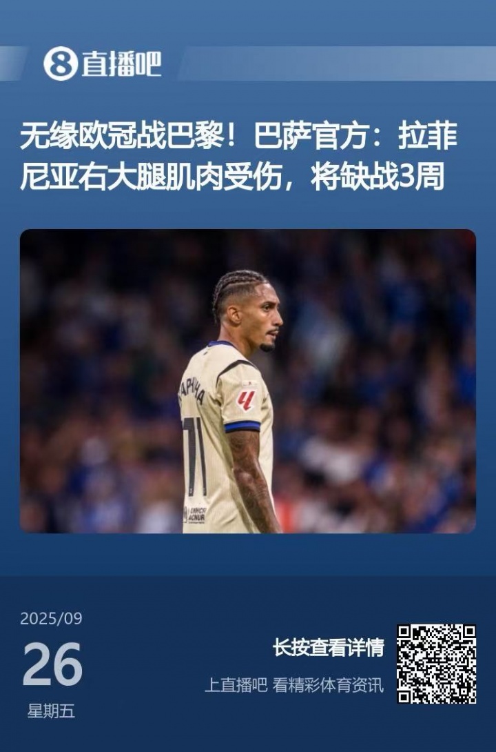 9月26日讯 今日巴萨官宣拉菲尼亚以及霍安-加西亚伤情,拉菲尼亚将伤缺3周,苏超直播霍安-加西亚将伤缺4-6周。