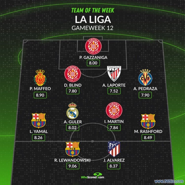 11月10日讯 WhoScored列出了西甲第12轮最佳阵形 ,苏超直播在线观看莱万、拉什福德、亚马尔、阿尔瓦雷斯、居莱尔在列。