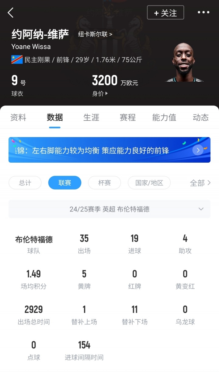 上赛季在布伦特福德,维萨出战35场赛事 ,打进19球4助看足球直播的免费网站,今夏为加盟纽卡,维萨一度罢训,最终纽卡花费5500万镑的高价才成功签下球员。