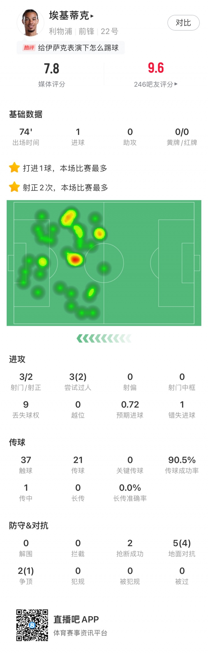 伊萨克腹股沟不适,苏超直播半场被换下。维尔茨本场贡献2次助功 ,埃基蒂克攻入一球。