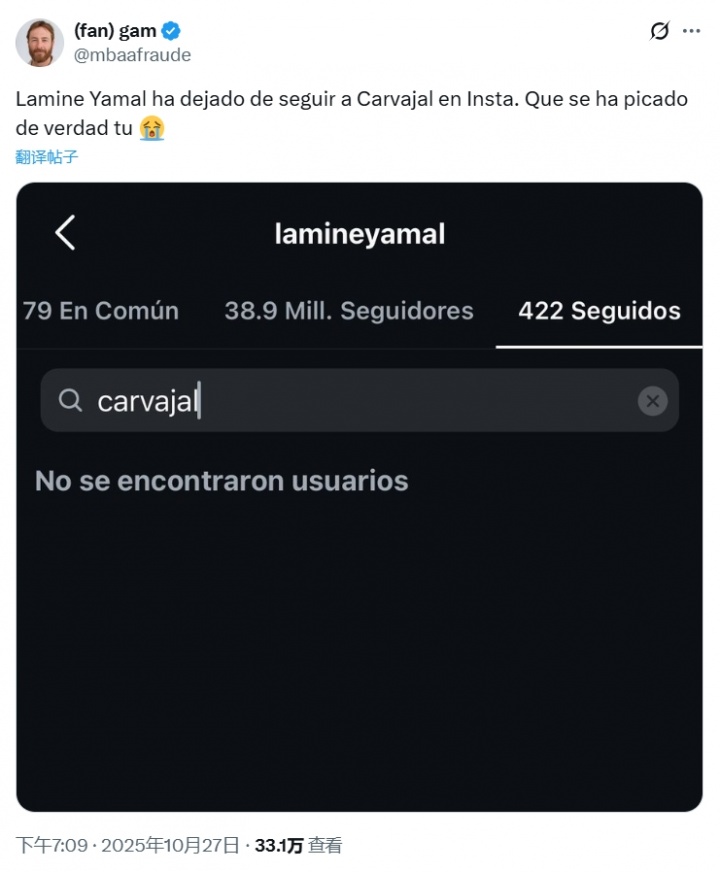 10月27日讯 今天西班牙国家德比之后,有不少球迷发文表示亚马尔取关了卡瓦哈尔,经查证目前两人确实未互相关注,但是否是因为今天两人的冲突取消关注还有待确认。