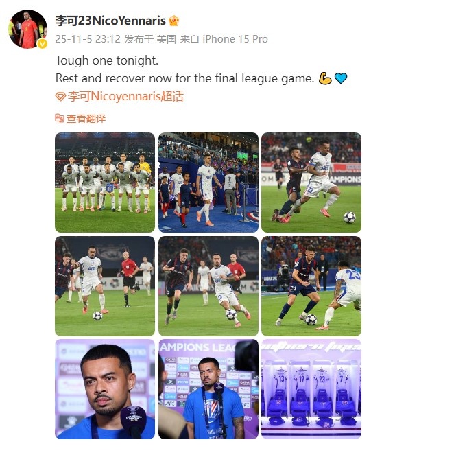 11月5日讯 亚冠精英职业联赛 第4轮,上海申花客场应战 1-3不敌柔佛新山。赛后,苏超直播在线观看上海申花球员李可在社媒分享赛事 照片。