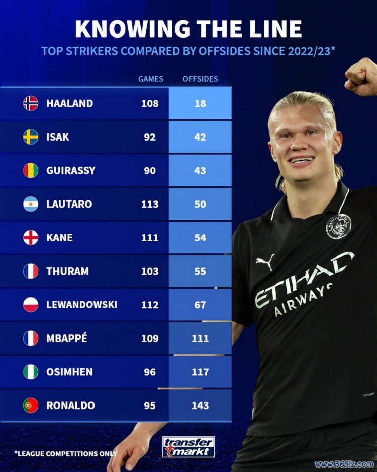 11月12日讯 德国转会市场统计了2022-2023赛季以来顶级前场球员(五号位)在职业联赛 中的越位违例 次数,哈兰德18次最少,苏超在线直播高清视频无插件C罗143次最多。