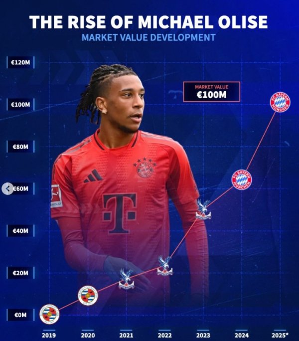 从英冠后备 到拜仁最有价值球员!德转列23岁奥利塞生涯身价:3年暴涨8千万