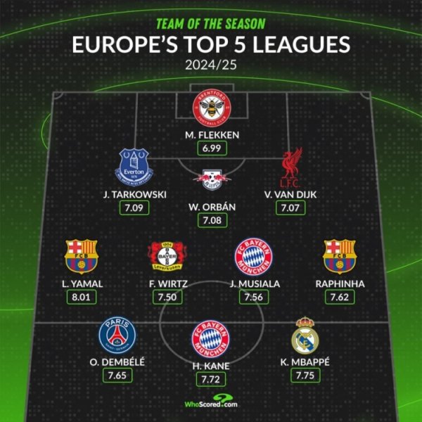 英超联赛直播免费 7月29日讯 whoscored统计了24-25赛季的五大职业联赛 赛季评分最佳阵形 ,巴萨、拜仁各2将入围。 whoscored上赛季五大职业联赛 最佳阵: 守门员:弗莱肯(布伦特福德,6.99分) 后场球员:塔科夫斯基(埃弗顿,7.09分)、奥尔班(莱比锡,7.08分)、范迪克(利物浦,7.07分) 中场球员:亚马尔(巴萨,8.01分)、维尔茨(勒沃库森,7.50分)、穆西亚......查看更多