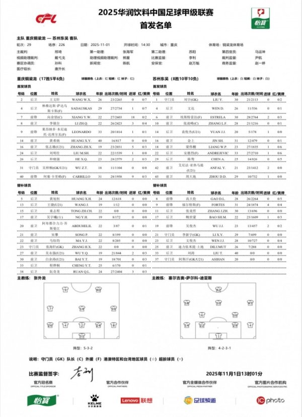 重庆铜梁龙vs苏州东吴杆位:莱昂纳多先发 周大地、艾尼法出战