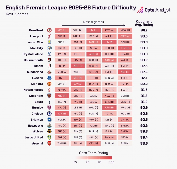 布伦特福德未来五个对手的平均评分高达94.7,位居各队之首。其赛程依次为:主场作战 迎战曼城、客场应战 应战 西汉姆联、主场作战 对阵利物浦、客场应战 对阵水晶宫,最后回到主场作战 迎战纽卡。